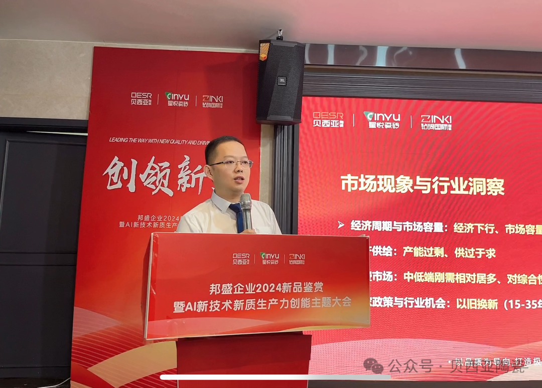 峰會上,眾成事業部常規品牌營銷中心總經理助理江軍以【瓷造者 · 向新而生】為主題,深度分析當前房地產市場的最新變化、市場的價格戰問題、行業現狀及發展態勢等市場問題,通過分析終端態勢、市場突圍路徑、AI 賦能以及新產品超白坯瓷磚、復刻釉瓷磚、超防滑瓷磚、天鵝絨瓷磚等新產品的推出,并AI 新技術為切入點,為品牌以及終端賦能新活力,為新周期下公司與經銷商伙伴的共創共享注入全新活力,為品牌高質量新發展創能蓄勢。